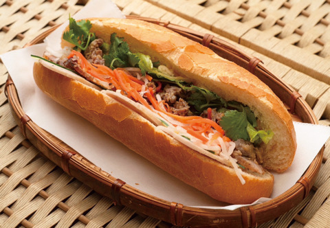 サクサクのパンに、焼き豚、ベトナムハム、牛肉とさわやかナマスを挟んだバインミー(ベトナムパン)。