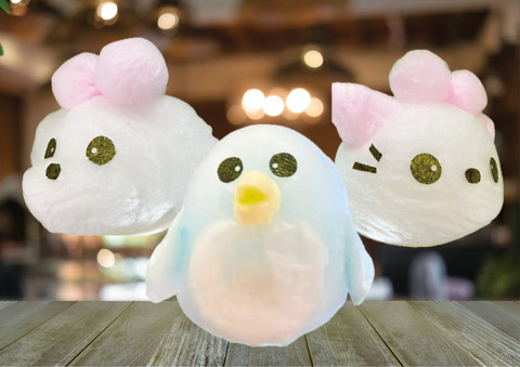 いちごやコーラなどの味付きザラメから生まれる、思わず笑顔になる可愛いキャラクター綿菓子が楽しめる。