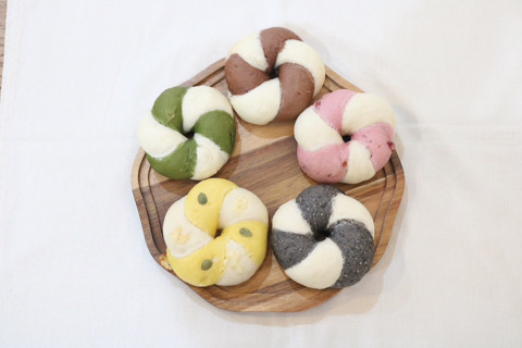 お花のようにねじねじ巻いたこんにゃく入りのベーグルは、もちもち新食感!定番の5種類を販売。