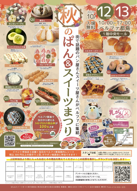 10月12日(日)・13日(月祝)の2日間、「ベルファ都島ショッピングセンター」にて、ぱん&スイーツまつりが開催されます!