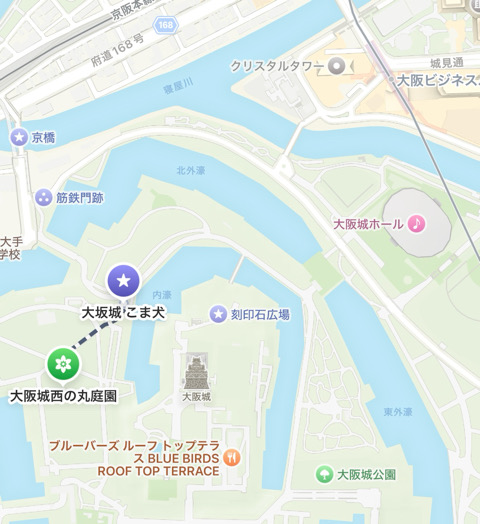 私は、大阪城ホール側からナビを見ながら歩いて行ったのですが、大坂城こま犬の近くの門は鍵がかかっていて通れなかったので、大手門側から行かれることをおすすめします。