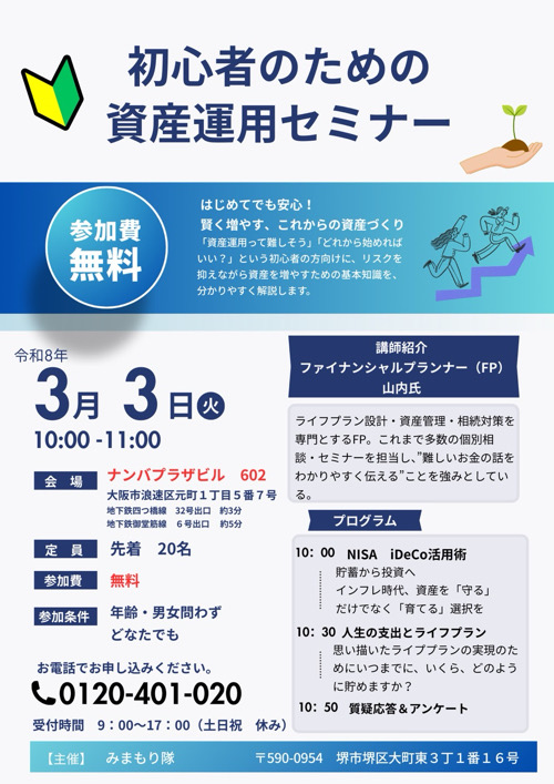 3月3日(火)10時から、資産運用の基本を学べる「初心者のための資産運用セミナー」が、ナンバプラザビル602にて開催されます。リスクを抑えながら資産を増やすことがこのセミナーの特徴!
