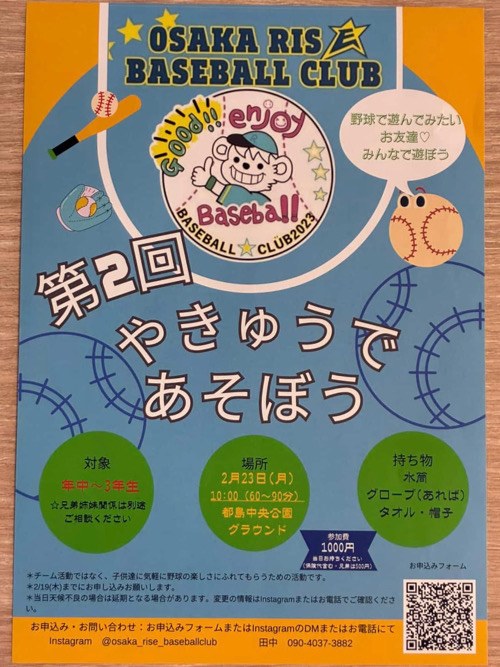 2月23日(月・祝)10:00~、都島区の少年野球チーム「OSAKA RISE BASEBALL CLUB」さんがイベントを開催されます★