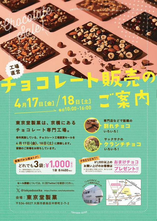 都島区役所近くにあるチョコレート専門工場「東京堂製菓」さんにて、毎年恒例の工場直営チョコレートセールが開催されますよ!