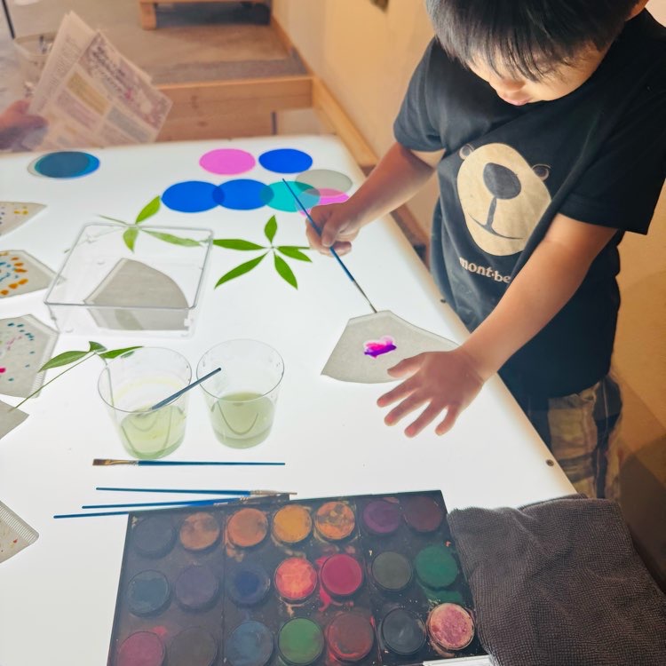 子どもたちは、絵の具や自然物、廃材、デジタルツールなどさまざまな素材に触れながら、自分の興味や発見をもとに活動を進めます。