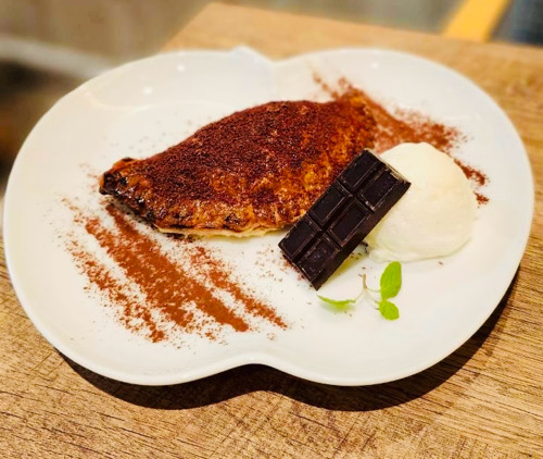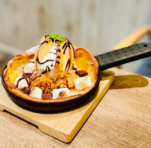 薄めのパンケーキ生地に、りんごや生クリーム・マシュマロ・チョコ・りんごジャムなど、組み合わせ次第で味がどんどん変わる楽しさも良き。パリパリ食感も楽しんでほしいと、生のりんごがちょこんと乗っているのもかわいいですよね。