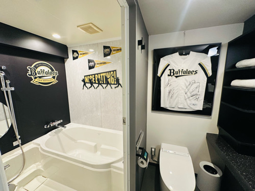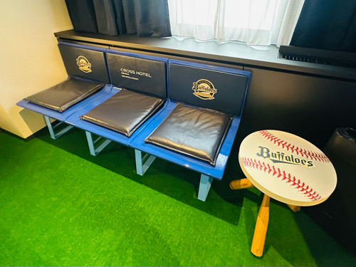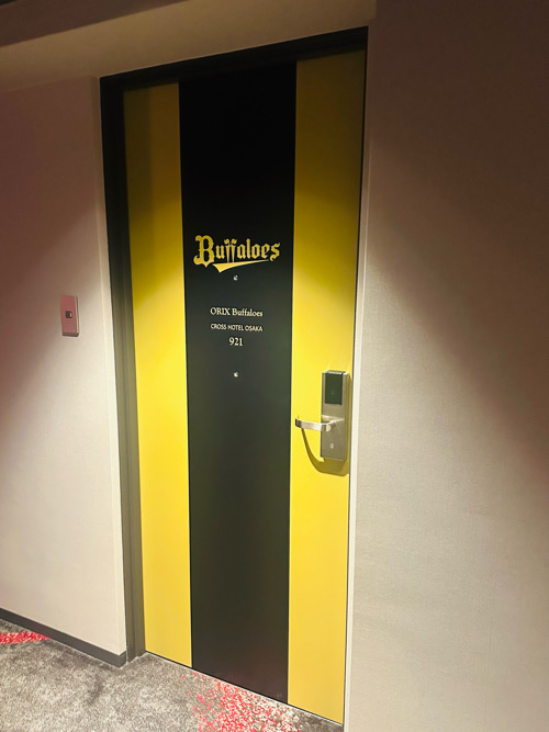 お察しの通り、オリックス・バファローズとのコラボレーションルームなので、扉を開ける前から、ネイビー&ゴールドの球団カラーが高揚感を演出します。新しくなったロゴも誇らしく輝き、期待感は最高潮に。