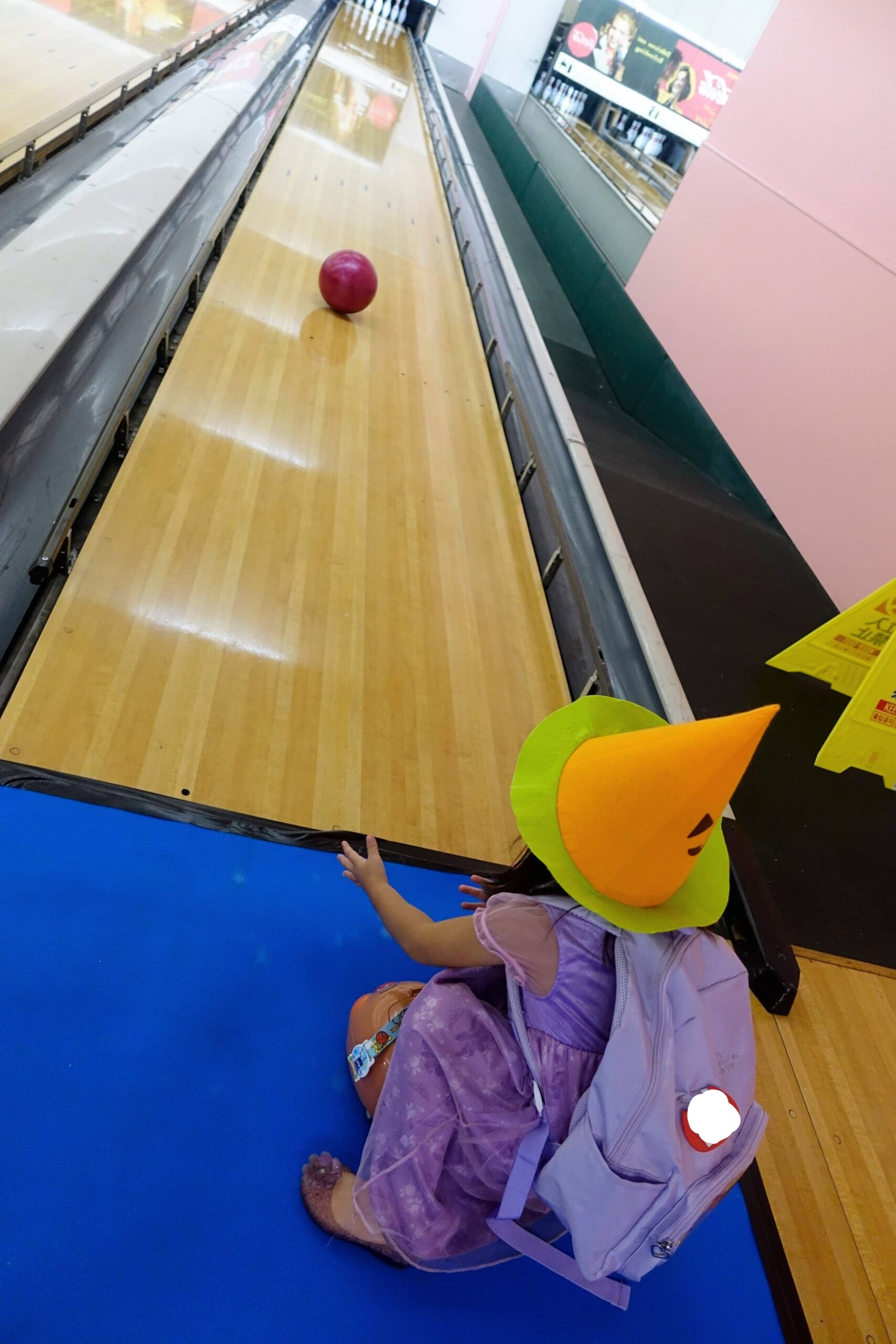 私たちは今福のボウリング王国「スポルト」からスタート!受付には協賛店のお菓子がずらりと並び、娘は早くも大興奮。