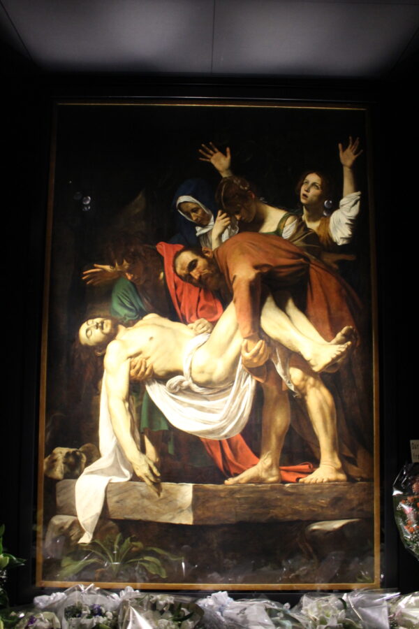 次に向かうのはカラヴァッジョの名作『キリストの埋葬』が展示されているスペースなのですが、実はここはバチカンパビリオンになります。「美は希望をもたらす」をテーマに掲げ、パビリオンのロゴはサン・ピエトロ大聖堂と日本の太陽を融合し、キリストを「世界の光」として表現。またこの空間は、再生と団結の世界共通言語として、芸術と信仰を称えています。