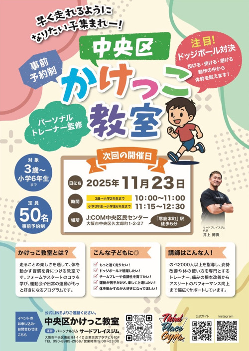 子どもの「もっと速く走りたい!」を叶えるイベントが、11月23日(日)に大阪メトロ堺筋本町駅そばの J:COM中央区民センターにて開催されます!