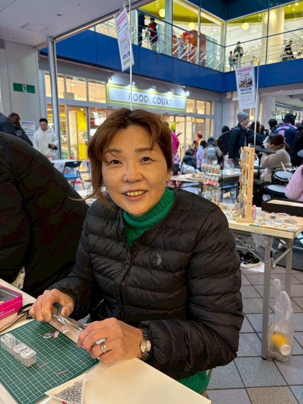 ふじたさんは、ふだんお母さんをしていて、かじとこそだてをがんばっています。このイベントを通じて、みんなに自分で作るよろこびを感じてほしいといってました。わたしは、きょうインタビューをしてみて、書くのがつかれた。なぜかというと、お店の名前がえいごだったから、書くのが大変だったからです。ブースでは、みんなにやり方を教えているからたいへんそうだった。自分もキーホルダーを作ってみたかったです。キーホルダーもイヤリングも作るのが楽しそうだった。