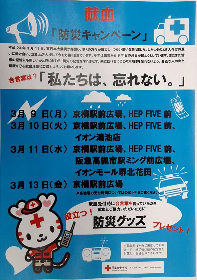 ママ記者ニュース2020.03.09 2020.03.11 inotti 献血にご協力を ツイート シェア はてブ LINE Pocket 血液センターさんからのお知らせです。 新型コロナウイルスの感染拡大の影響により現在献血状況が大変厳しくなっております。 患者様に血液をお届けするため、ご協力をお願いします。 お問い合わせ先 赤十字血液センター 大阪市城東区森之宮2丁目4番43号 TEL (06)6962-7654(直) http://wanonaka.jp/ http://www.jrc.or.jp ツイート シェア はてブ LINE Pocket feedly