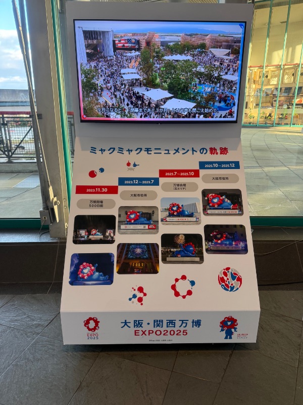 ミャクミャクの横には寝そべりミャクミャクモニュメントの軌跡とともに、モニターには万博当時の映像も流れていて、エモい気分に。