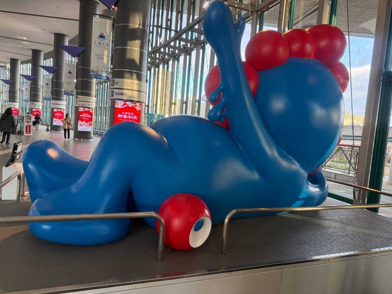 昨年12月27日。ATCITM棟2階にお引越しが完了した「寝そべりミャクミャク」。実際に会いに行ってきたのですが、市役所の前にいたときよりも大きく感じます。このミャクミャク、高さ2メートル、幅3.3メートルあり、重さは約300キロもあるんだとか。どうりで、屋内だと大きく感じるわけですね。