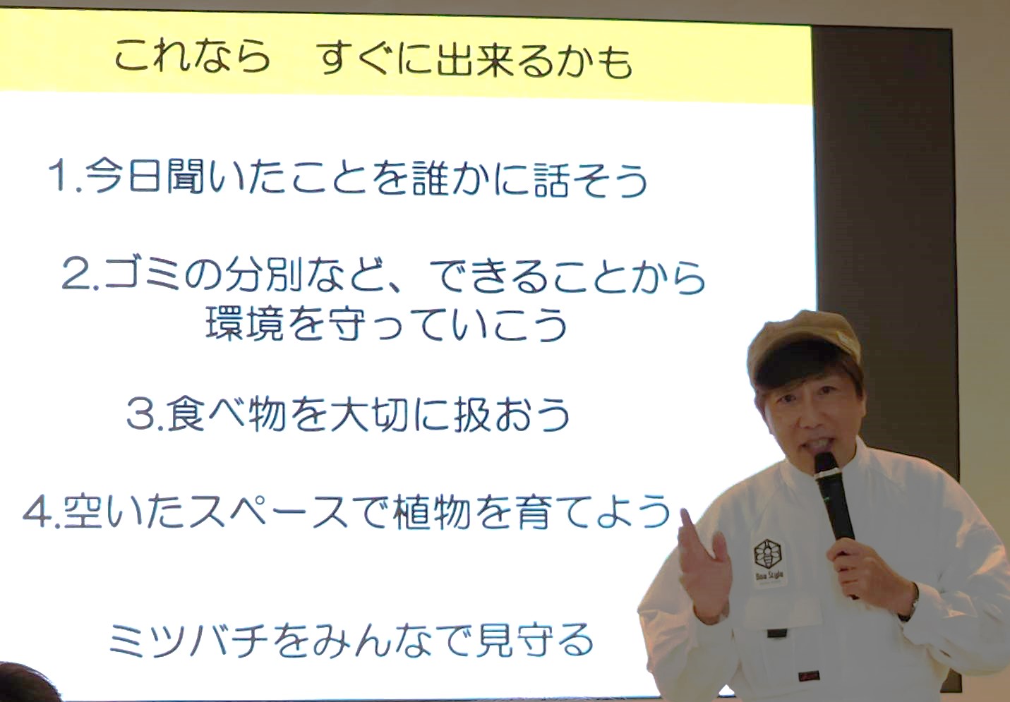 登壇したのは、梅田のまちで都市養蜂を実践している梅田ミツバチプロジェクト理事長・小丸和弘さん