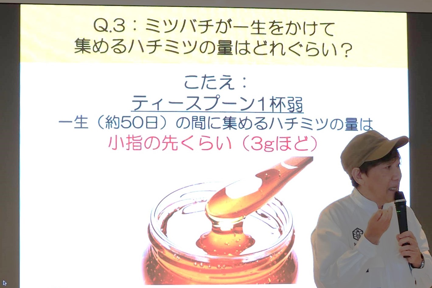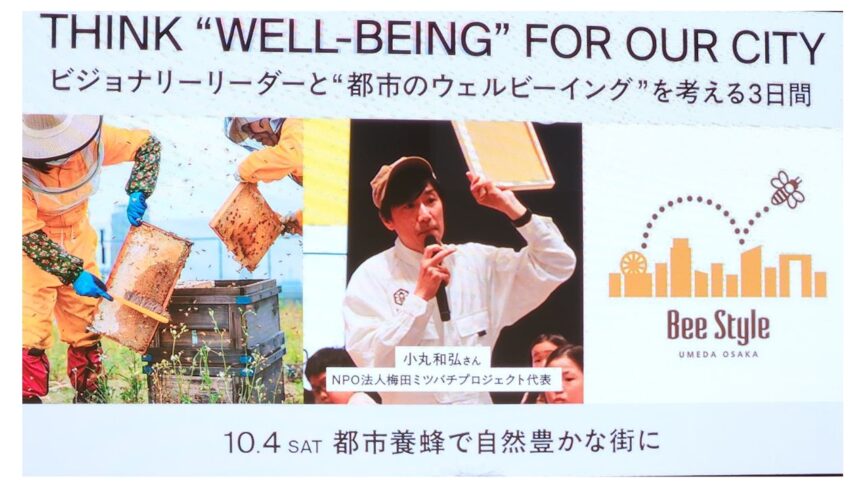 登壇したのは、梅田のまちで都市養蜂を実践している梅田ミツバチプロジェクト理事長・小丸和弘さん