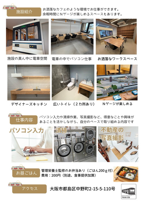 コンセプトは電車で、事業所内に大きな車両があるのが特徴。希望者には1食200円(別途、食事提供加算)で管理栄養士監修のお弁当がいただけることや、行政書士や司法書士・宅地建物取引士など専門家との連携があり、生活面まで見据えた支援も整っています。都島区、旭区、城東区の北部、鶴見区は送迎可能(送迎加算)。