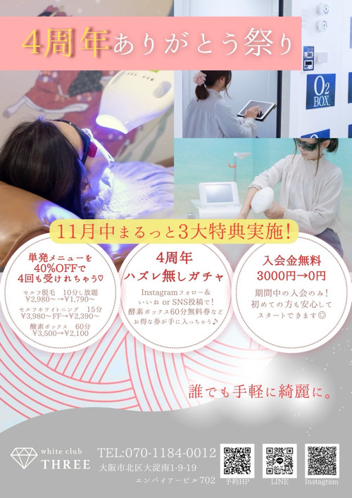 梅田スカイビル近くのセルフケアサロン「whiteclub.THREE 福島店」さんが、2025年11月で4周年を迎えます★