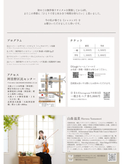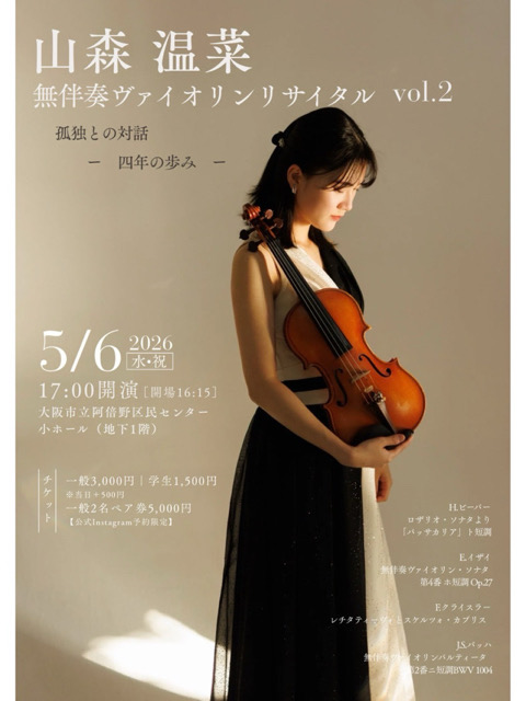 【阿倍野区】山森温菜 無伴奏ヴァイオリンリサイタルvol.2「孤独との対話ー四年の歩みー」
